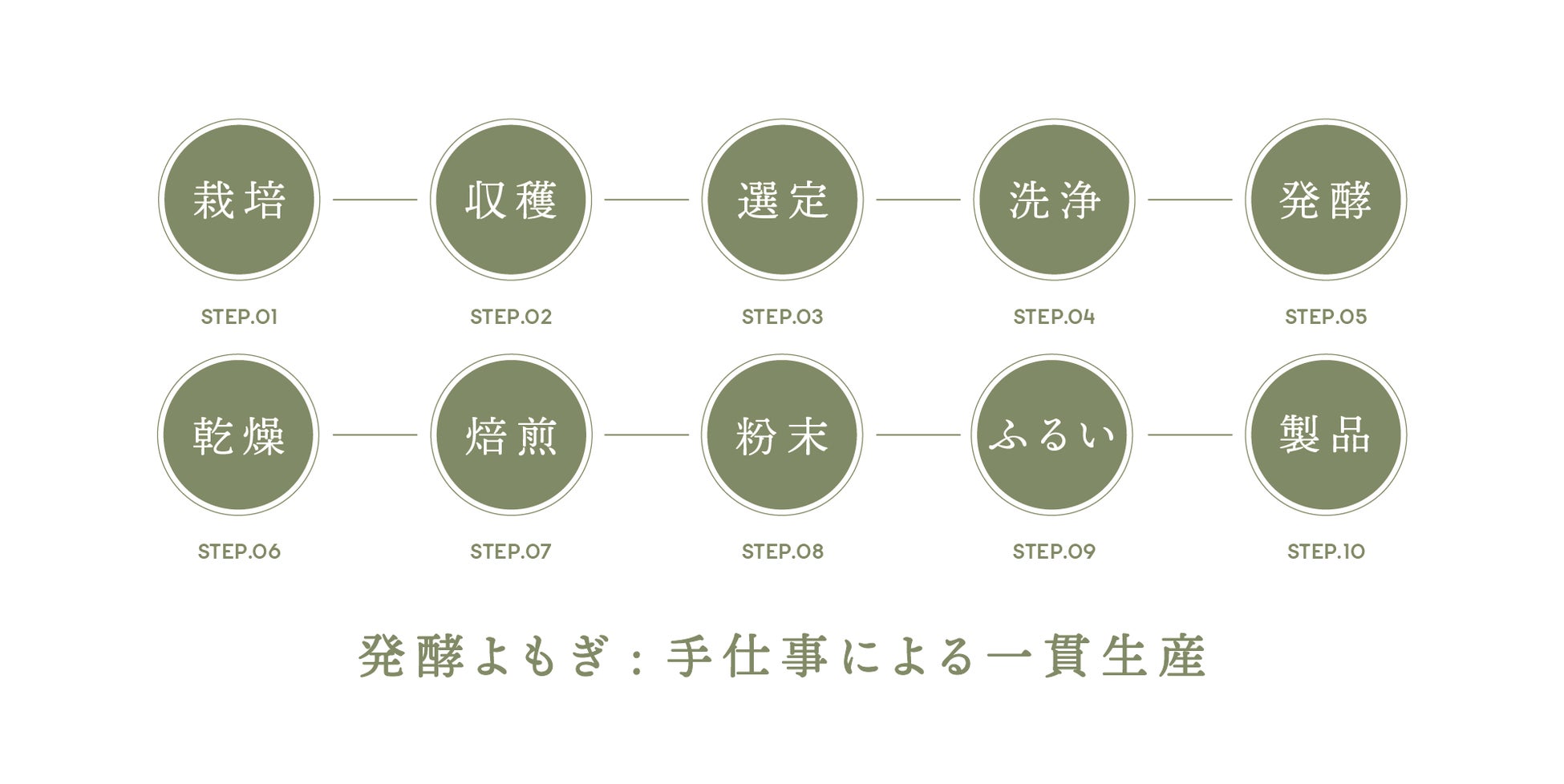 無農薬栽培で丁寧に育てたよもぎを発酵させることで、爽やかな香りと芳ばしくまろやかな味わいを引き出しています。さらに、パウダー状にすることで、体内に直接取り入れやすくなり、内側から整える力を発揮します。