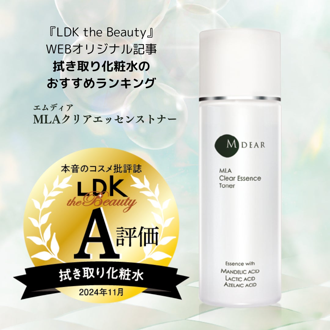 医療機関専売エイジングケア*コスメ M-Dear(エムディア) の角質・毛穴ケア化粧水「エムディア MLAクリアエッセンストナー」が、『LDK the Beauty』WEBオリジナル記事< 拭き取り化粧水のおすすめランキング >にて、高評価である【A評価】を獲得いたしました。