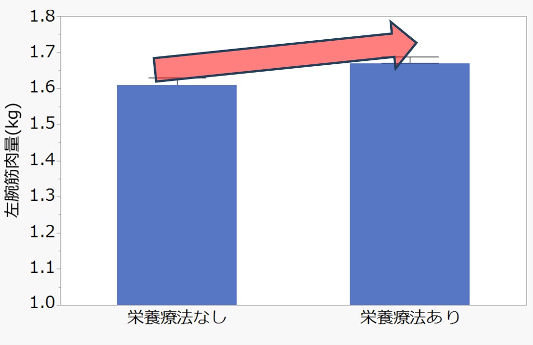 栄養療法を取り入れた方は、栄養療法を取り入れていない方に比べ、腕の筋肉量が多く(左図)、握力が高い(右図)ことが分かりました。