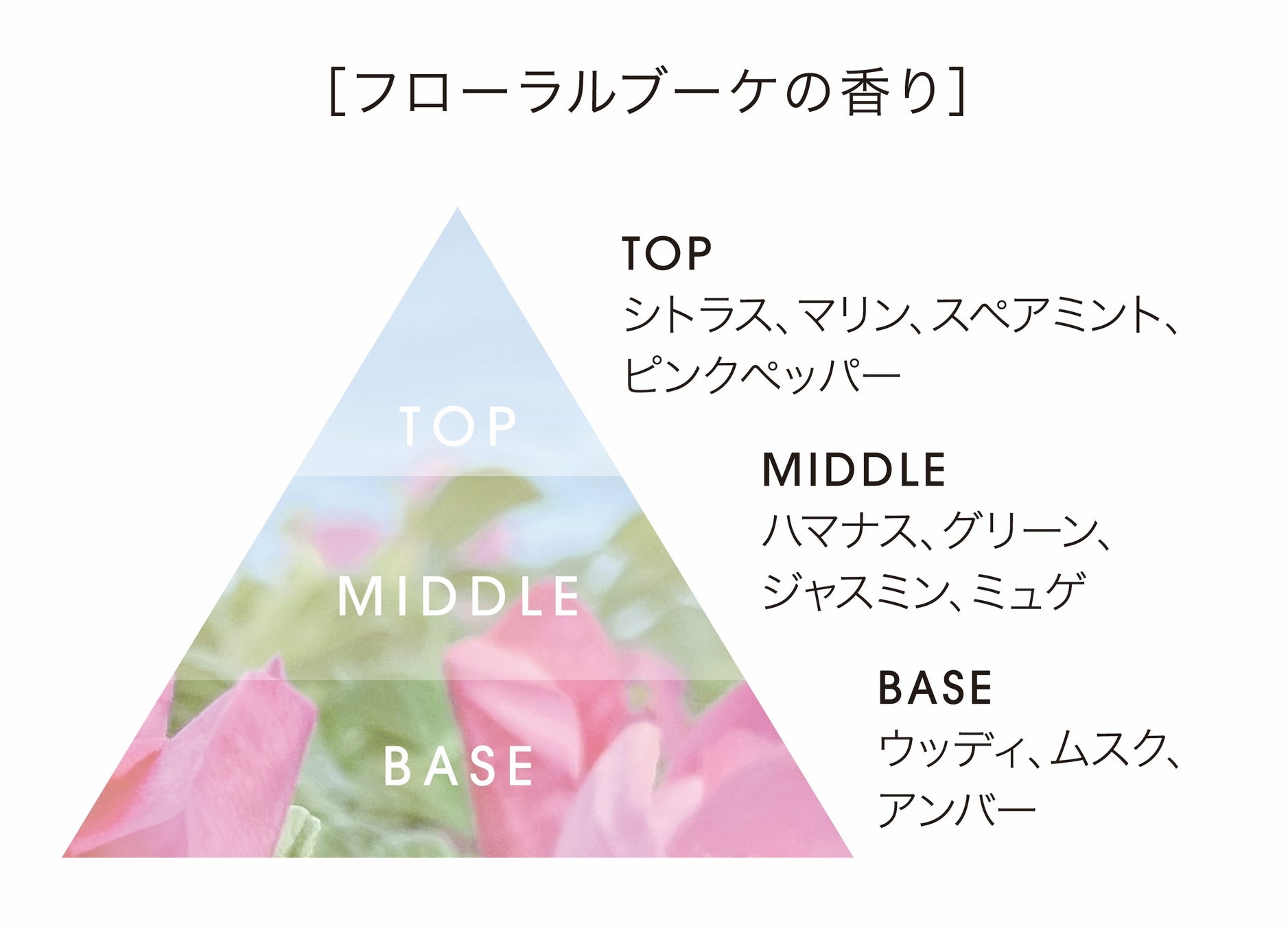 フェミニンでありながらも天真爛漫で、芯の強さと陽気さに溢れつつも慎ましい、多面的な女性の魅力を感じさせるオードパルファム。弾けるシトラスに華やかなフレッシュローズ、甘くパウダリーなスウィートムスクがやわらかく溶け合います。