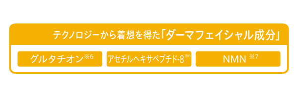 ※1加水分解カイメン(基剤) ※2オリゴペプチド-20(保湿成分) ※3オリゴペプチド-24(保湿成分) ※4オリゴペプチド-34(保湿成分) ※5アセチルデカペプチド-3(保湿成分) ※6保湿成分 ※7ニコチンアミドモノヌクレオチド(保湿成分) ※8肌にうるおいを与え、乾燥により目立った毛穴を目立たなくすること ※9乾燥してキメが乱れた肌 ※10うるおいを与えることで艶やかに見える印象 ※11加水分解カイメン(基剤)、ヘキシル3-グリセリルアスコルビン酸(保湿成分) ※12金、ヘキシル3-グリセリルアスコルビン酸(保湿成分)※13ヘキシル3-グリセリルアスコルビン酸(保湿成分) ※14効能評価試験済み ※15年齢に応じたケア ※16加水分解カイメン(基剤)、パルミチン酸レチノール(保湿成分) ※17金、パルミチン酸レチノール(保湿成分) ※18パルミチン酸レチノール(保湿成分) ※19加水分解カイメン(基剤)、ヒト脂肪由来間葉系細胞エクソソーム(保湿成分) ※20金、ヒト脂肪由来間葉系細胞エクソソーム(保湿成分)) ※21ヒト脂肪由来間葉系細胞エクソソーム(保湿成分) ※22肌の水分、油分を補い保つこと ※23加水分解カイメン(基剤)、アゼロイルジグリシンK(整肌成分) ※24金、アゼロイルジグリシンK(整肌成分) ※25アゼロイルジグリシンK(整肌成分)*角質層まで