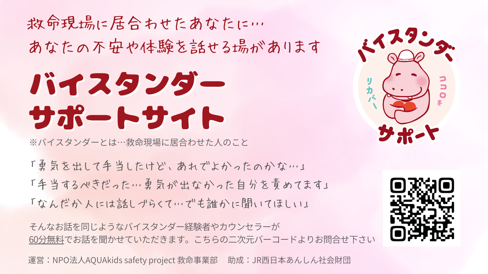 NPO法人AQUAkids safety project(救命事業部)が、JR西日本あんしん社会財団の助成を受け、2024年9月9日「救急の日」に開設した「バイスタンダーサポートサイト」は、まもなくオープンから半年を迎えます。この半年間で、救命現場に居合わせた人(バイスタンダー)の心のケアの必要性が改めて浮き彫りとなりました。