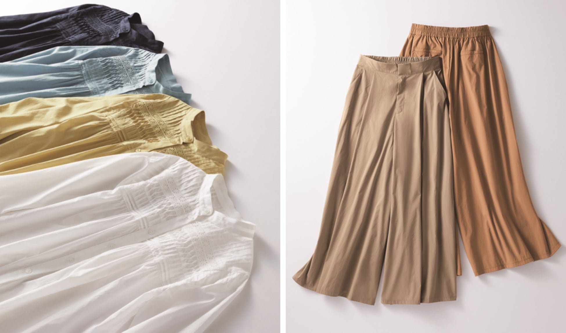 大人女性の体型の悩みを解消するハルメクの新ブランド!ウエストが総ゴムで、引っ張るだけで手間なく履けるパンツ。体に合わせてフィットする素材、立体マチによるすっきりシルエットをぜひ店頭で実感ください。
