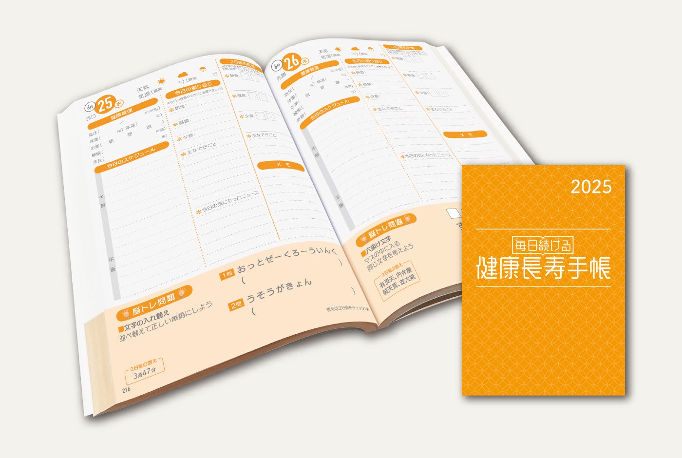 日頃のスケジュール管理はもちろん、今日の振り返りや2日前の出来事を思い出すことで短期記憶の訓練ができる手帳。毎日脳トレ問題にチャレンジすることもでき、健康コラムをはじめとした健康寿命に関する情報も充実。毎年改良を重ね、健康管理の睡眠時間や歩数の記入欄などをアップデート。25年度版は2.4万冊販売の大ヒット。