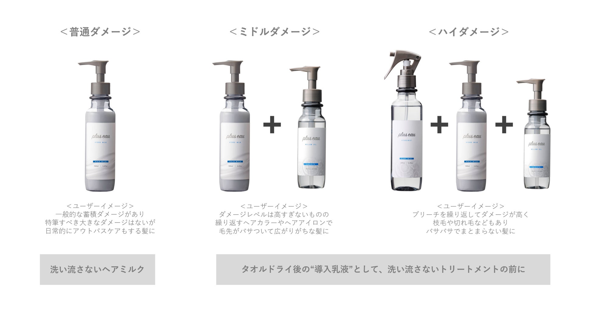 ダメージレベルに合わせて「プリュスオー ハイドロミスト」や「プリュスオー ヘアオイルシリーズ」と重ね使いしてもお使いいただけます。