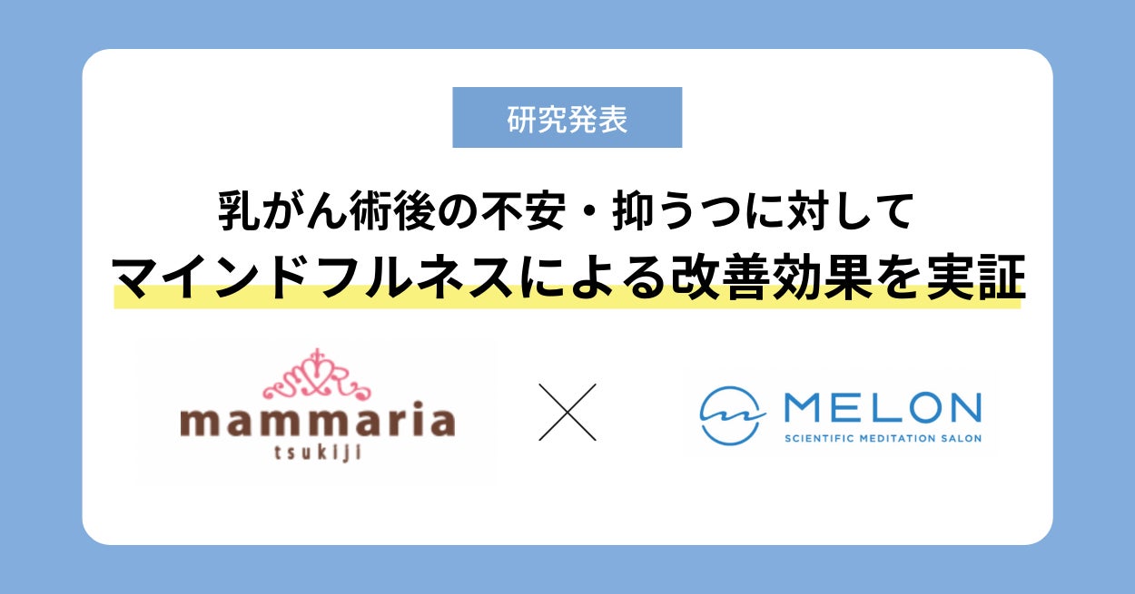 マインドフルネスを応用した人材・組織開発プログラムを提供する株式会社Melon(本社:東京都港区、代表取締役CEO:橋本大佑、以下「MELON」)が、乳腺専門クリニックmammaria tsukiji(聖路加国際病院パートナーズクリニック)と行った共同研究で、8週間のMELONオンラインプログラムが、乳がん患者の精神的不安の軽減に寄与することが明らかになりました。