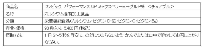 そこで、手軽に続けやすい方法でしっかりと栄養を摂り、成長期を本格的に乗り越えたいと思っている保護者とお子さまに向けて、水なしでかんで食べられて16種類もの成分を摂取できる「セノビック パフォーマンスUP ミックスベリーヨーグルト味」<チュアブル>を発売いたします。