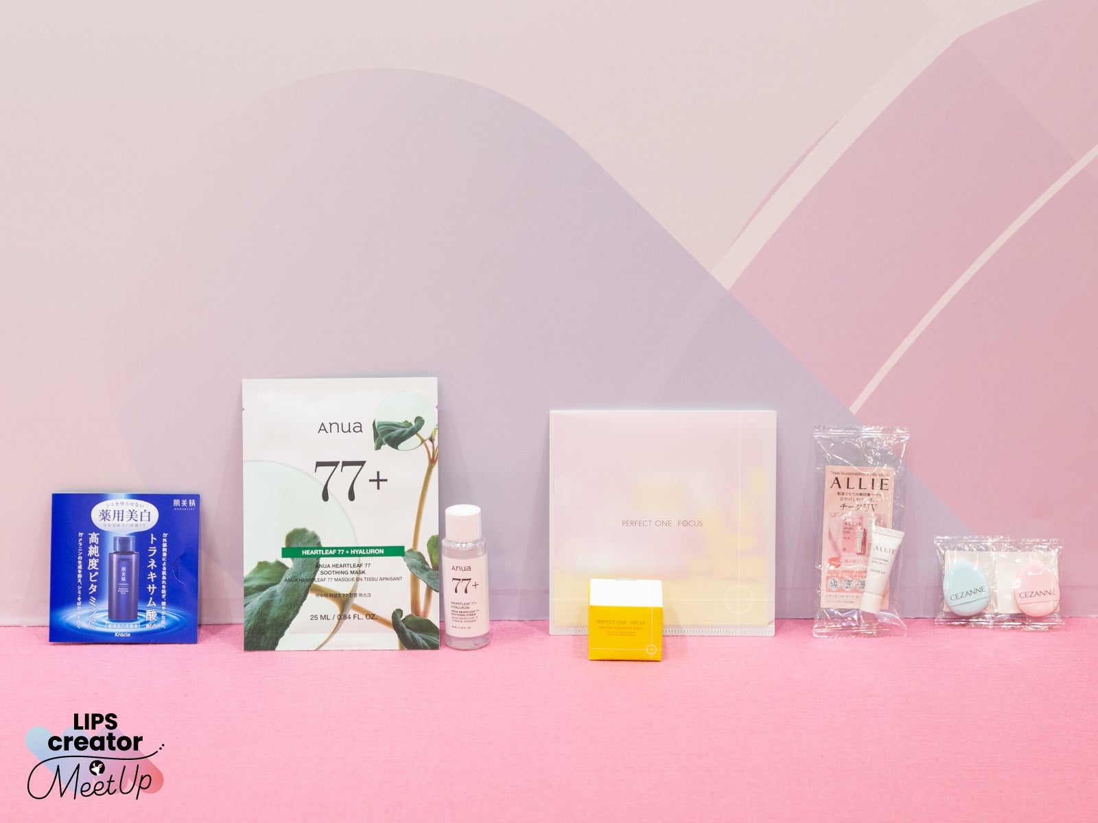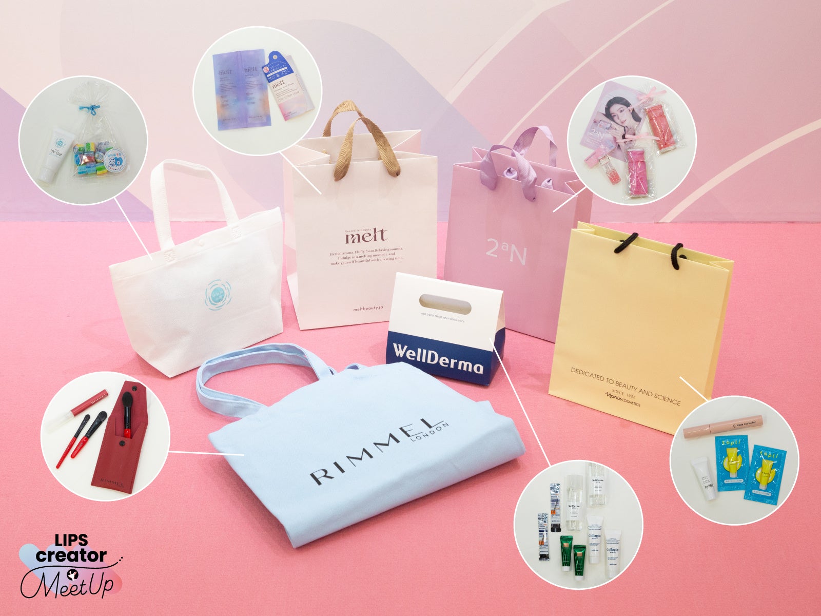 ブランドブースに並ぶアイテムは、クリエイターの自宅などにあらかじめお届け。事前配送のギフティングとは別に、当日会場で配布されたアイテムがこちら。人気商品のミニサイズやパウチ、ブランドロゴが印字されたパフなど、ここでしか手に入れることができないレアなものもあり、クリエイターのみなさんも大満足のご様子でした。