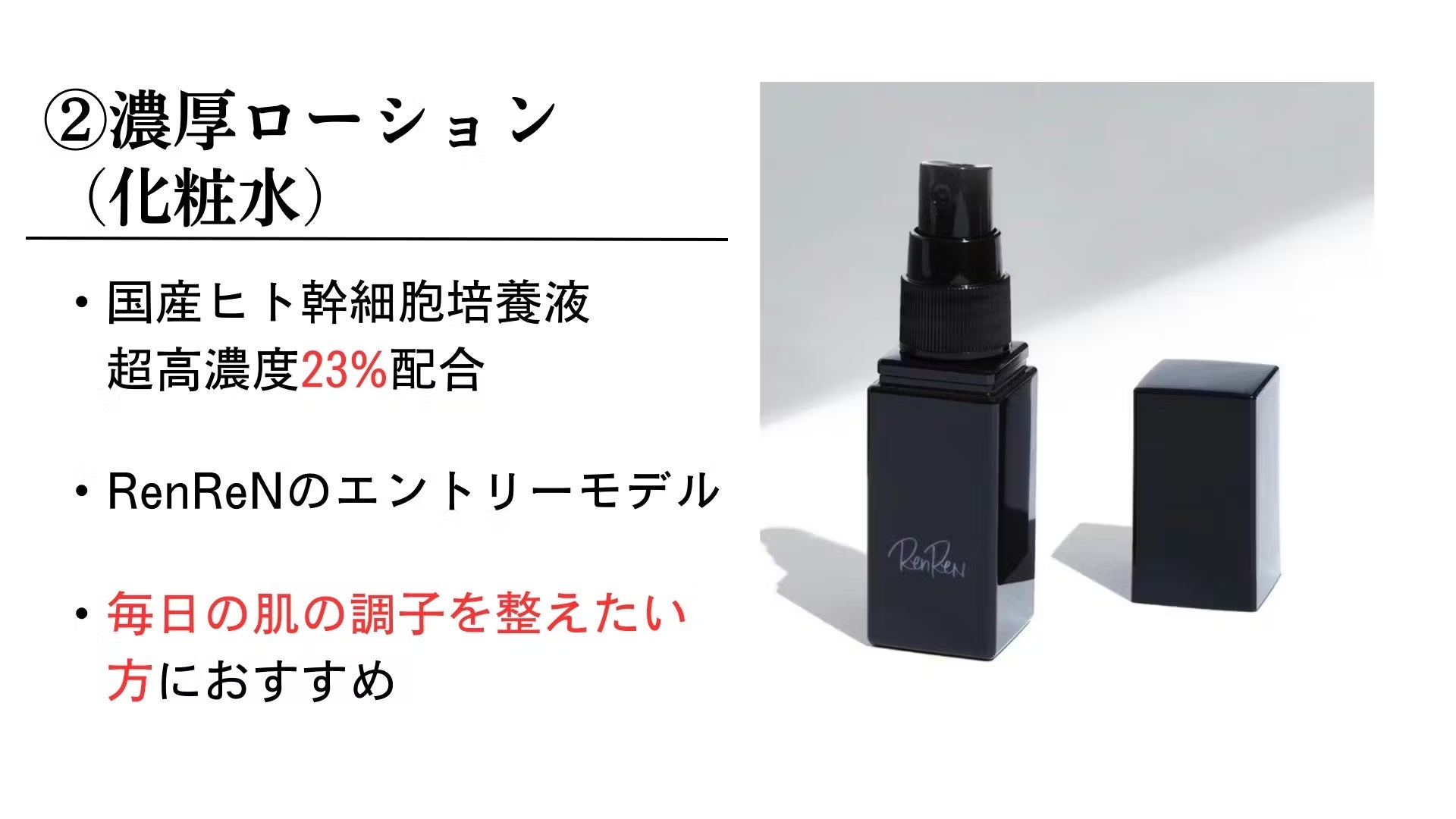 RenReNでは、超高濃度で配合したヒト幹細胞培養液で細胞を肌に浸透させることにより、元々備わっている自己治癒力を活性化させて生き生きとしたキレイな肌を目指すというアプローチを採用しています。