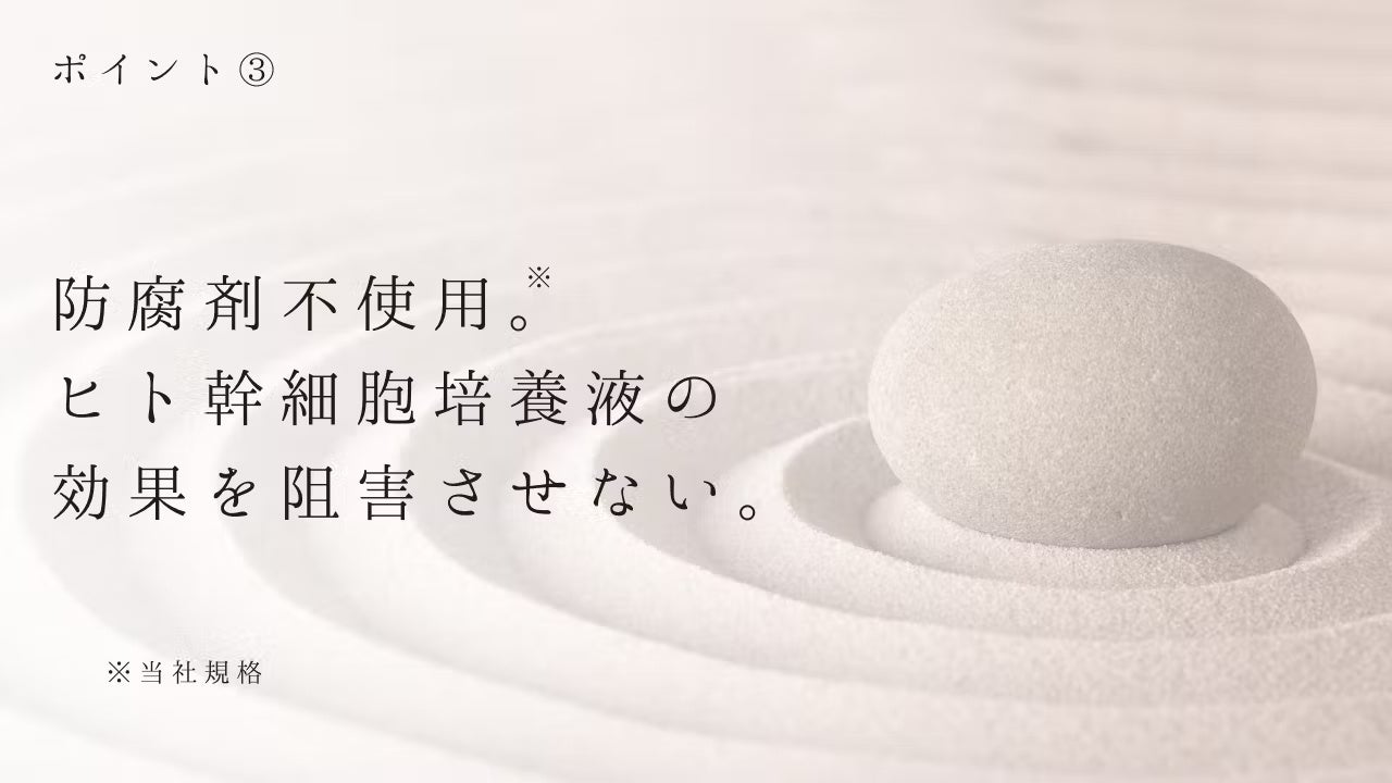 一般的には5%で高濃度と言われるヒト幹細胞培養液を、病院からの直接仕入れと製造会社との密な連携によって最大46%(※)の超高濃度配合に成功。細胞の力を活性化させることで「内側からキレイに」そして「使うほど肌が健康に」なることを目指しています。
