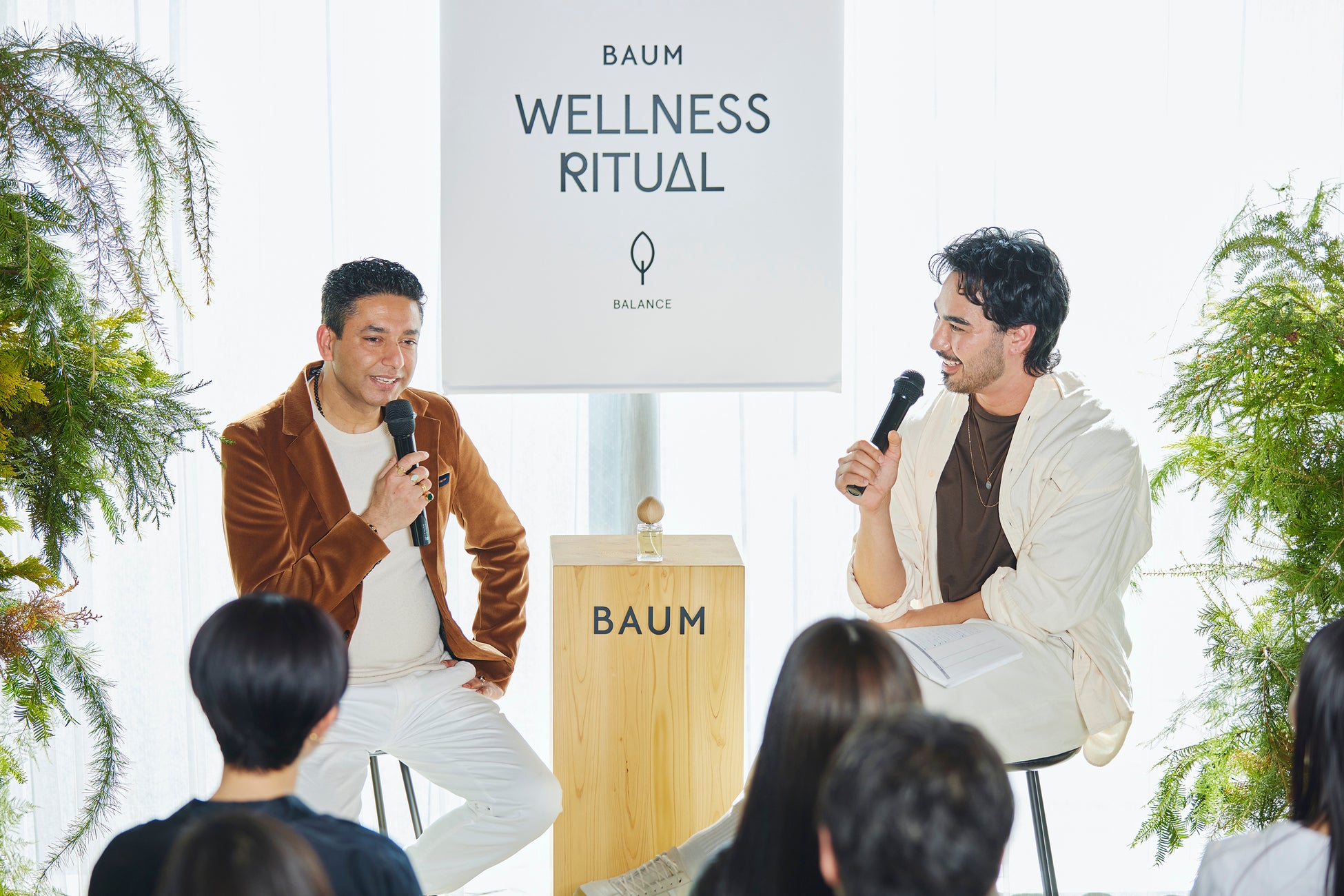 また、2月25日(火)には、ニーマル・ラージ・ギャワリ氏とNetflix「ボーイフレンド」で人気を博した高橋アラン氏をお迎えして1日限りのBAUM ウェルネスリチュアル(瞑想)体験イベントをIWAI OMOTEANDOにて開催。イベントには、阿久津ゆりえ、晶、浅利琳太郎、エモン久瑠美、櫻井貴司、東井彥晴などの多くのゲストが来場いたしました。ニーマル・ラージ・ギャワリ氏と高橋アラン氏によるトークセッションでは、「樹木は人間に近い存在であり、心に残ったネガティブな思考を吸収してくれる」とニーマル氏。樹木と瞑想のつながりや、瞑想を通して自分と向き合うことの大切さについてお話いただき、会場に訪れたゲスト全員でBAUMを代表する香り オーデコロン ウッドランド ウインズと共に「BAUM ウェルネスリチュアル(瞑想)」を実際に体験いただき樹木のように心をととのえていただきました。
