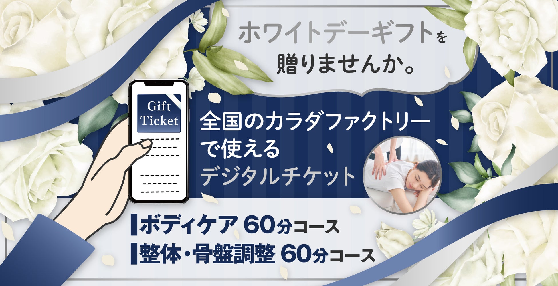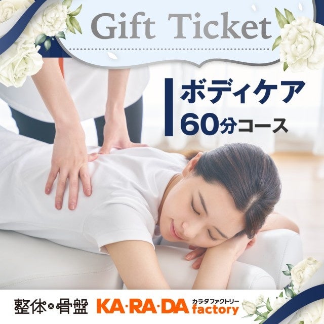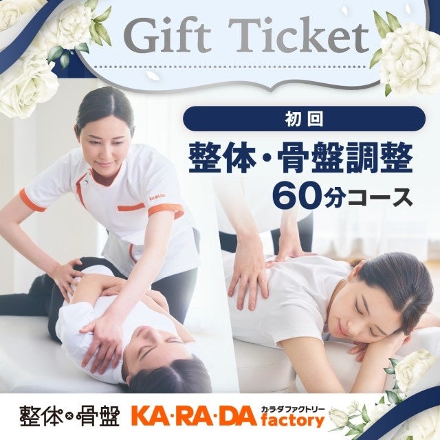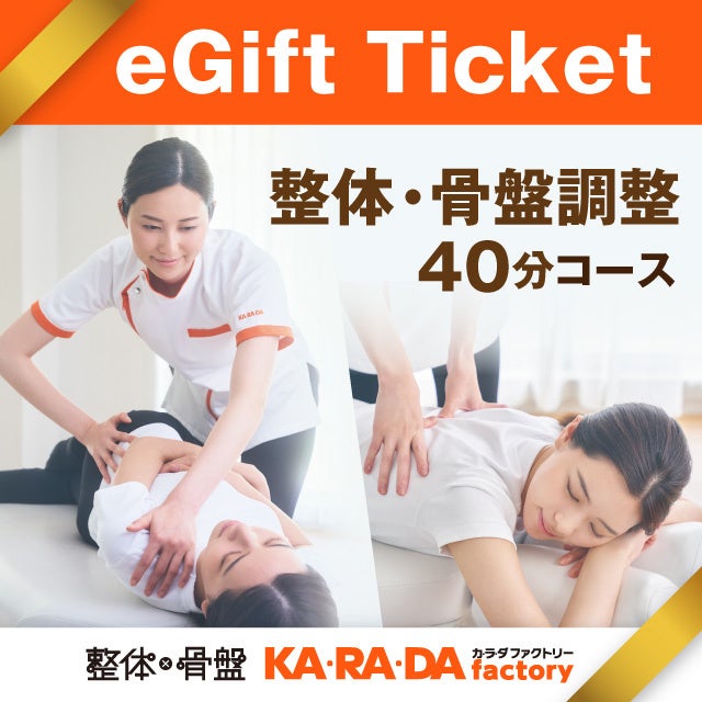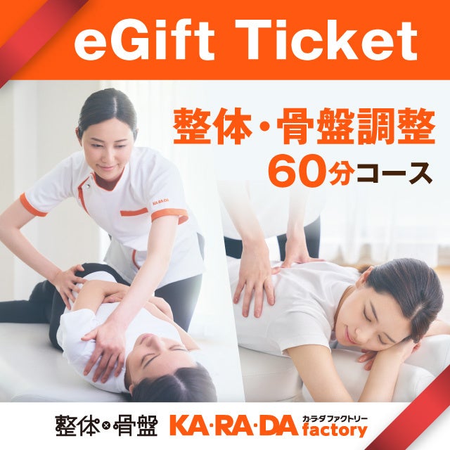 今回販売する施術チケットは、メールやLINEで贈れるデジタルチケット(eGIFT)で、全国のカラダファクトリーでご利用いただけるものです。初回 整体・骨盤調整とボディケア、2つのコースから選べるホワイトデーギフトチケットをご用意しました。