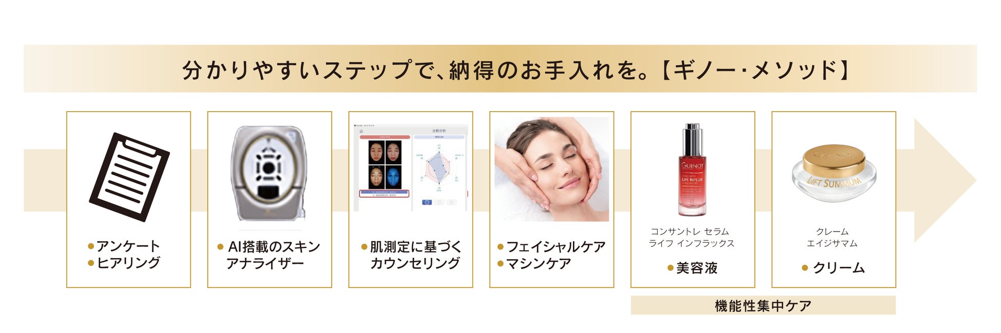 ギノーは一人ひとりの肌を正しく測定し、スキンケア製品の提案と健やかなお肌へと導くトリートメントを併用することが大切だと考えております。 スキンケア製品一つひとつが役割を担うことでお手入れ効果を引き出してまいります。