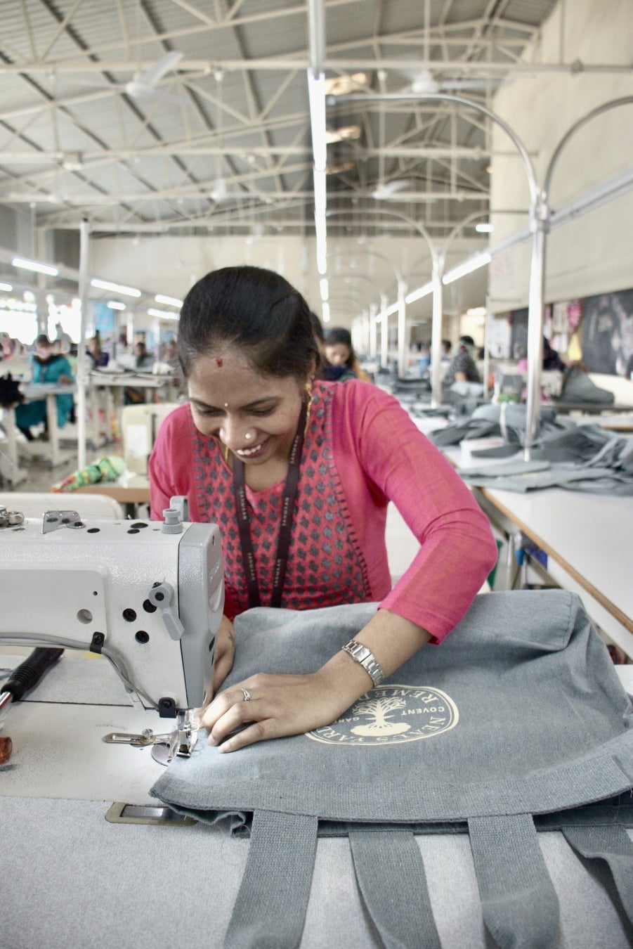 re-wrapは南インドの女性たちや農家の人々の経済的自立を支援しながらテキスタイル製品を製造する、イギリス発祥の女性支援団体。「ZAMP コットンバッグミニ」は、バッグを製造する工程で出る残布を活用したLow Waste(低廃棄物)なバッグ。re-wrapの製造工程で出る4個分のバッグの残布に、オーガニックコットンを25%混ぜた生地から作られます。