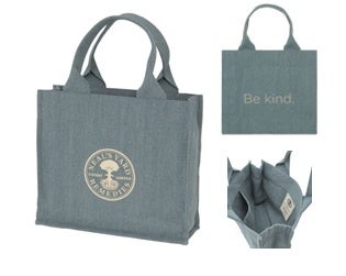 しっかりとした厚手の生地で、ランチやちょっとしたお出かけにちょうどよいサイズ感。裏面にプリントされた『Be-kind』には「サステイナブルを超え、すべての人、動物、地球環境、そして自分自身も大切に」というメッセージが込められています。