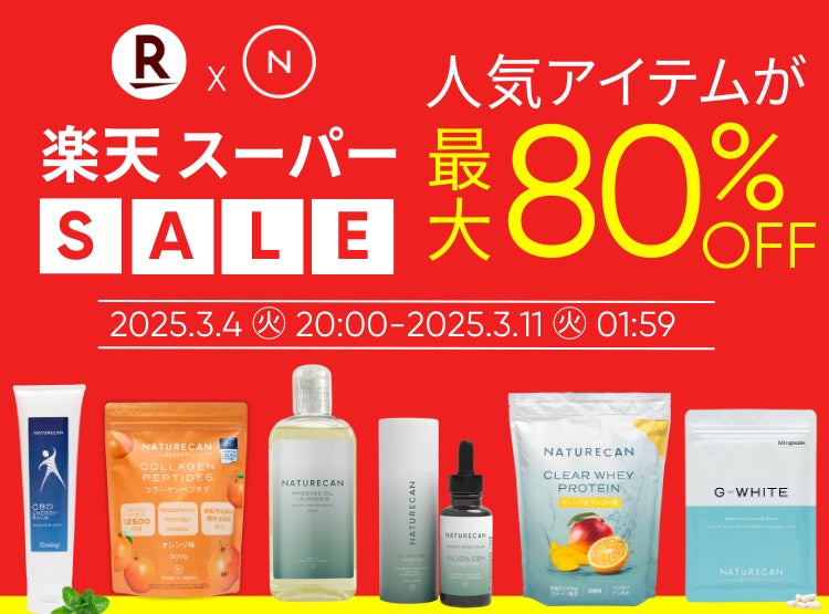 英国発CBD専門店Naturecanは、3月4日(火)20:00〜3月11(火)1:59まで開催される楽天スーパーSALEにおいて、人気商品のCBDオイルやクリアホエイプロテインをはじめとする数多くの商品を最大80%OFFにて販売致します。