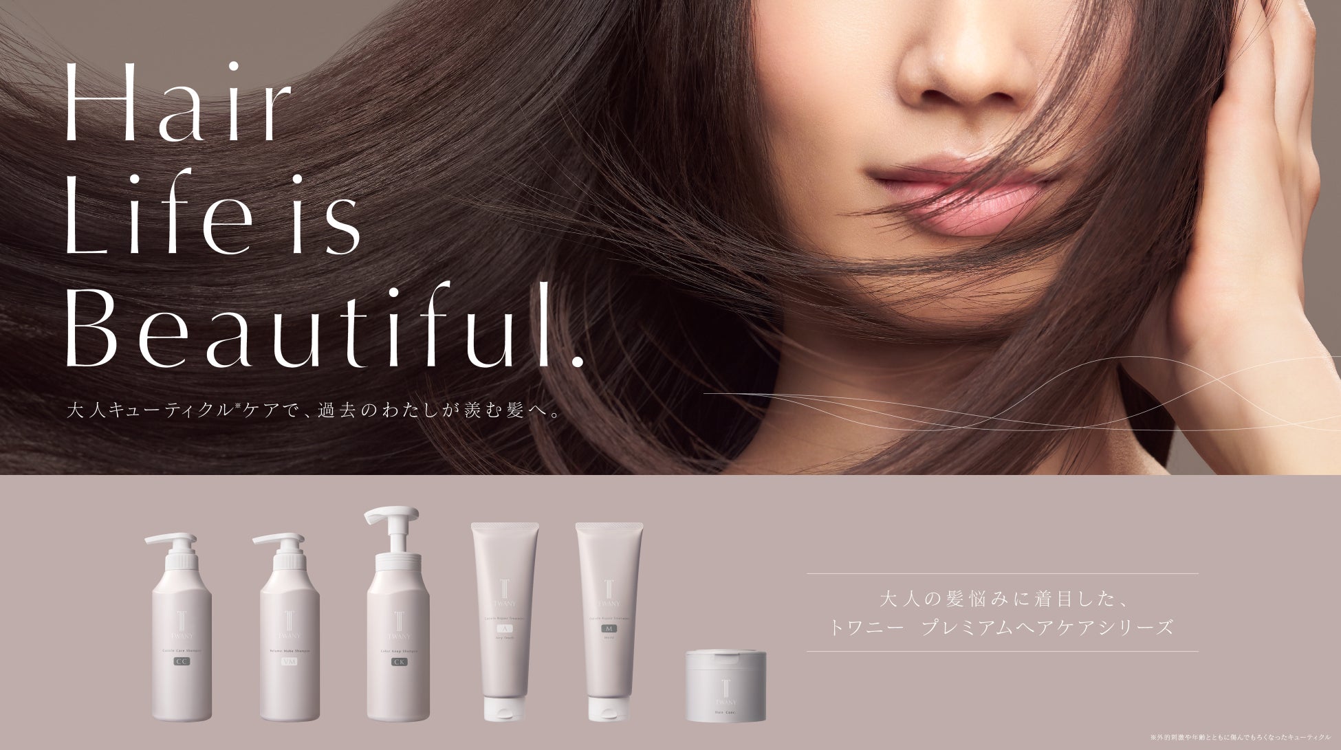 トワニーは1996年の誕生以来、女性の“美しさのリズム”に基づいた生涯カウンセリングを通じて、一人ひとりに寄り添った美容提案を続けてきました。今回、「どんな時でも美しい髪を楽しみたい」「何歳になっても好きな髪型を諦めたくない」そんな思いに応えるため、ブランド初となるヘアケアラインが誕生します。