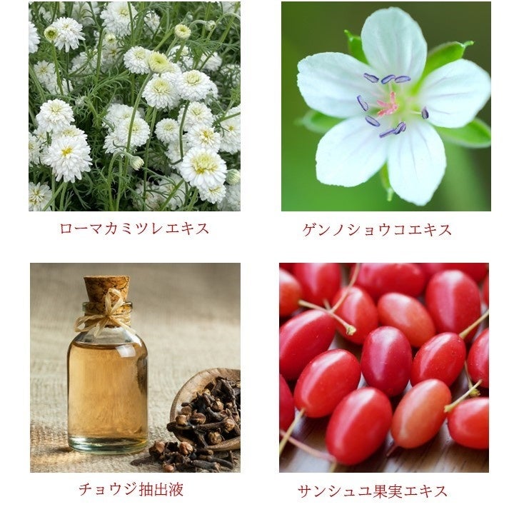 ※ローマカミツレエキス、ゲンノショウコエキス、チョウジ抽出液、サンシュユ果実エキス