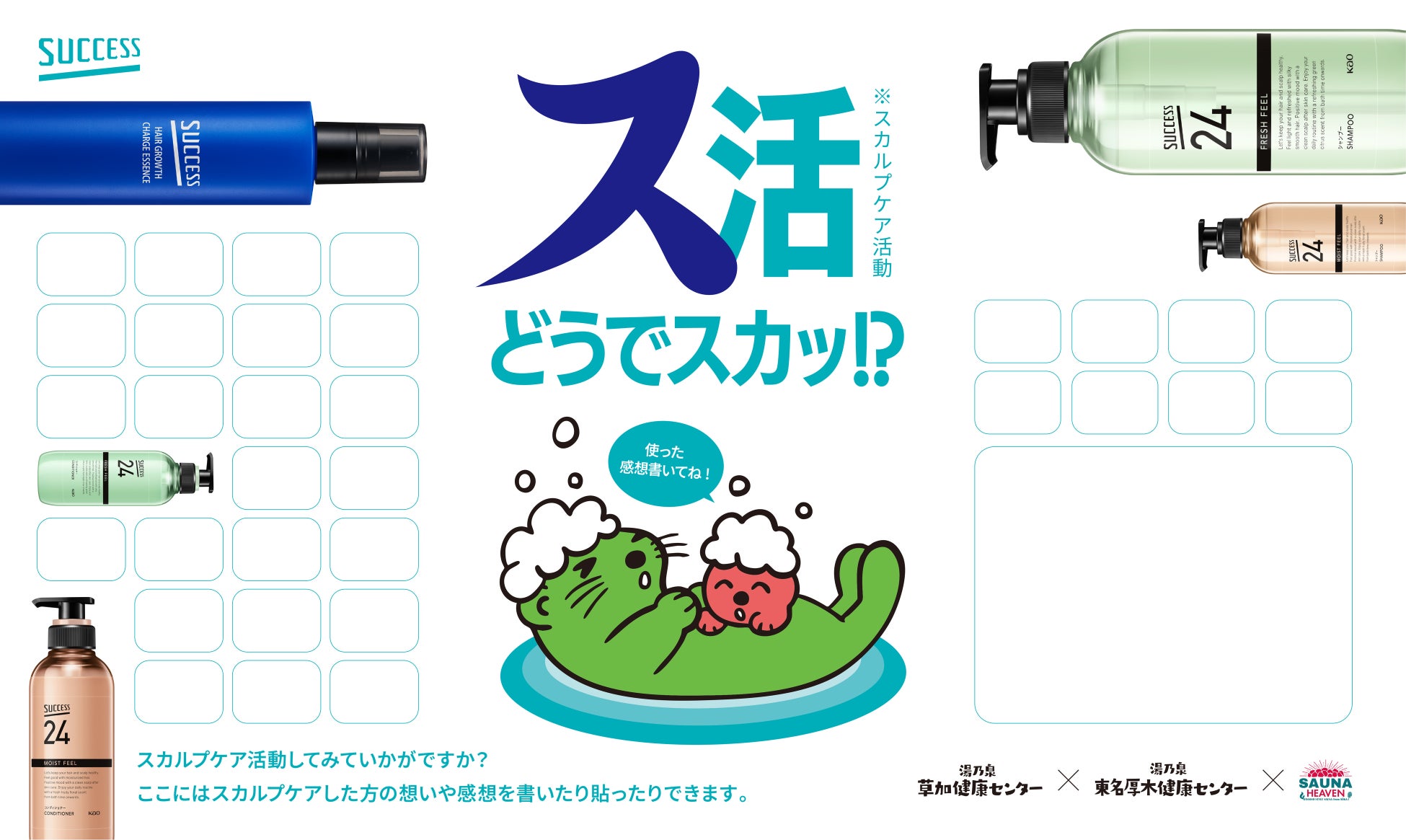 「サクセス」は、2024年秋に埼玉県草加市のサウナが人気の2施設「湯乃泉 草加健康センター」と「サウナヘヴン草加」とのコラボイベント「ソウカ!イコウカ!」を実施し、大変好評をいただきました。今回は、第二弾として、前回実施の2施設に「湯乃泉 東名厚木健康センター」を加え、新たにスカルプケアをコンセプトとしたコラボ企画を実施いたします。今回のコラボ企画では「サクセス 髪を育てるチャージエッセンス【医薬部外品】」を用いたスカルプケア活動を期間中、来場いただいた方に体験いただきます。コラボ企画を通して、今まで頭皮・髪に対して意識を向けられていなかった方にも、より手軽に、丁寧にできる頭皮ケアをご提案いたします。