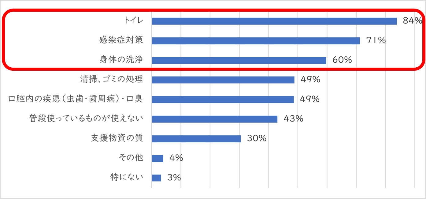 ・災害時の衛生管理において、1位「トイレ」や2位「感染症対策」、3位「身体の洗浄」に不安を感じている