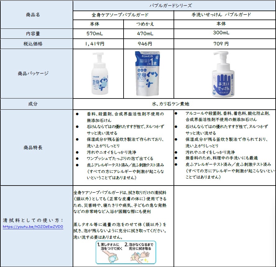 また、手洗いせっけんバブルガードは、子どもからご年配の方まで、頻繁に洗っても手肌に優しいため、災害時の感染症対策として重要な手洗いに最適です。