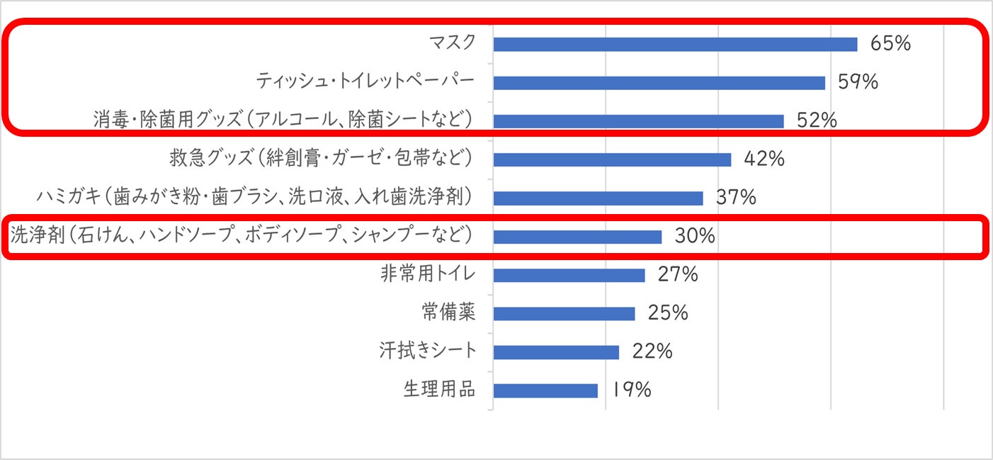 ・「日用品」「衛生用品」として備えているのは、1位「マスク」、2位「ティッシュ・トイレットペーパー」、3位「消毒・除菌用グッズ」で、70%の方が身体の洗浄剤を備えていない