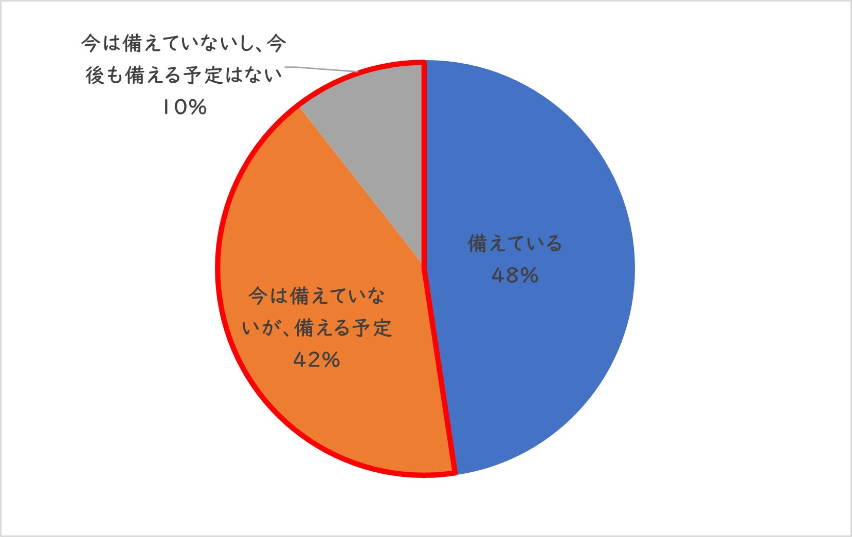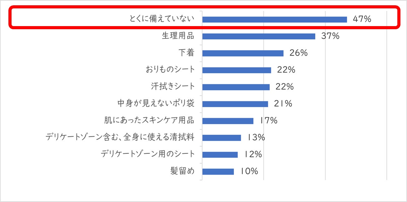 ・約半数の方が、女性向けに備えておくと良いものがあることを認識しているが、女性向けの防災用品を「とくに備えていない」
