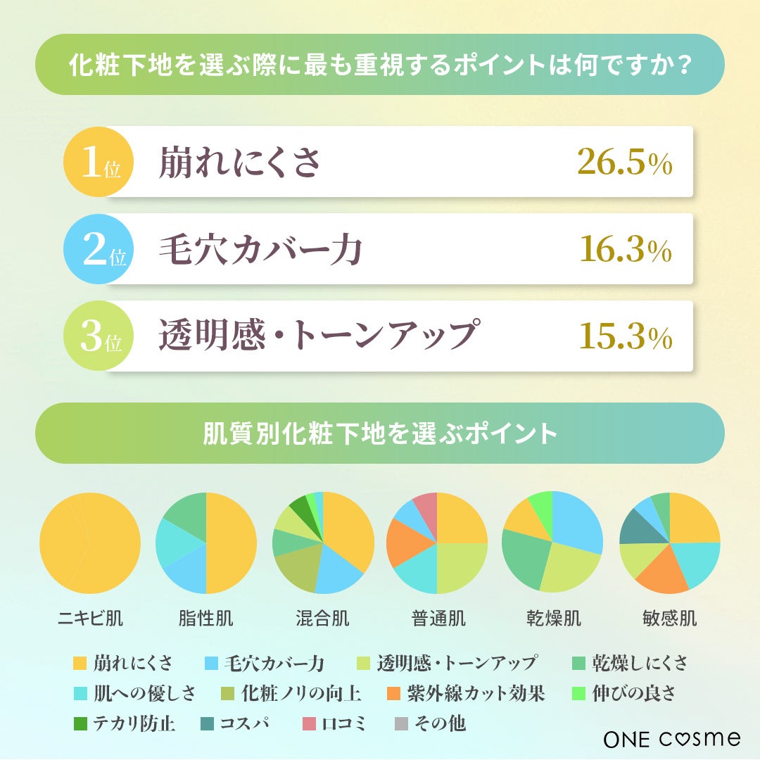 化粧下地を選ぶポイント1位は「崩れにくさ」でした。肌質別に人気の化粧下地など美容意識の高いユーザー98名の実態を大調査!