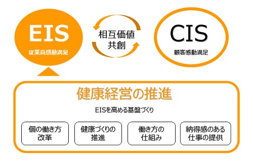 さらに「従業員感動満足(EIS)」の向上と「顧客感動満足(CIS)」の相互作用が、全てのステークホルダーの「生きがい創り」に繋がるという考えのもとで、人的資本経営の一環として健康経営を推進しています。