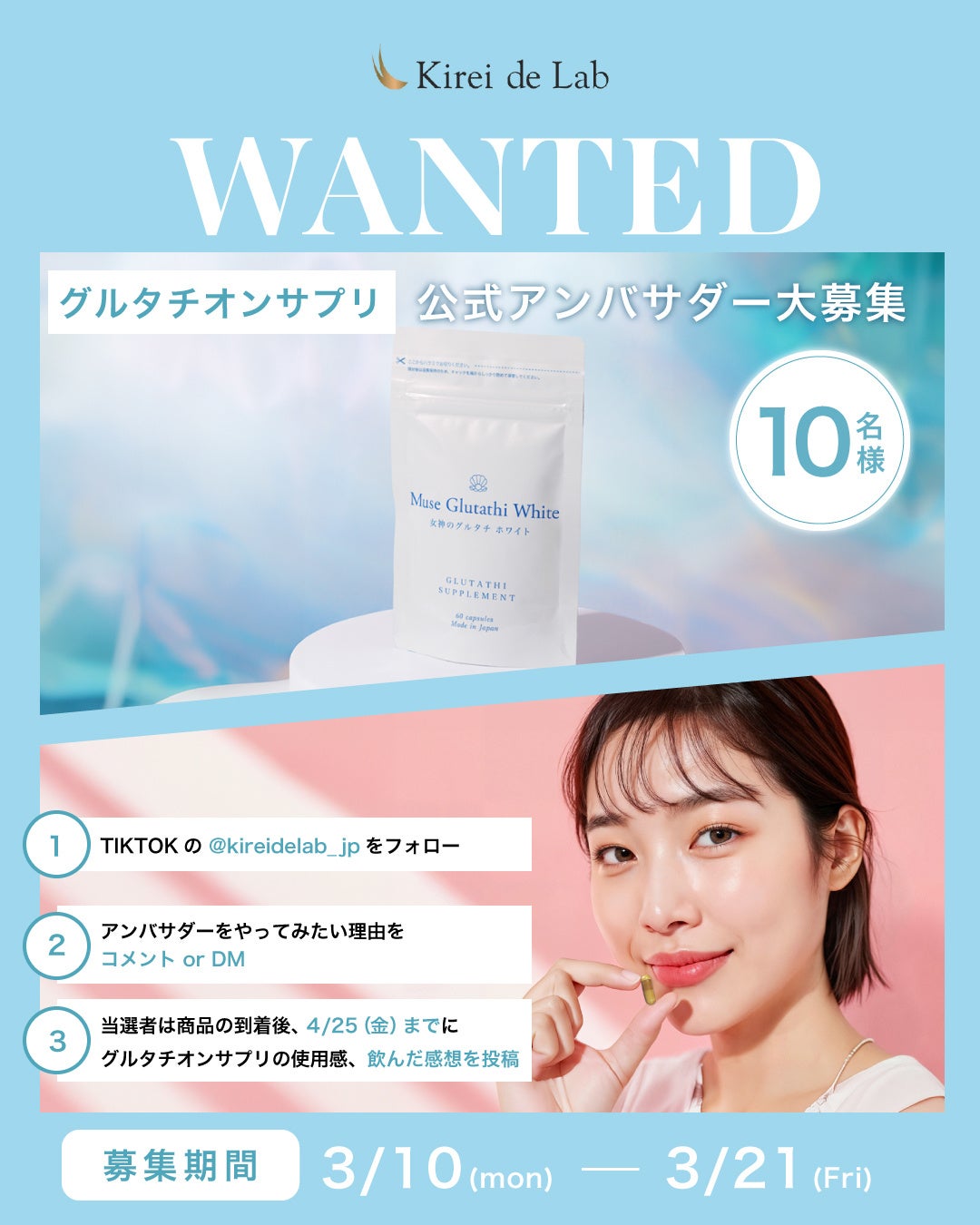 株式会社ウエルネス・ラボ(神奈川県横浜市)が展開するキレイデラボから、韓国で話題の成分グルタチオンを配合した「ミューズ グルタチホワイト」サプリが新発売しました。今回、新発売記念として合計50名様に当たるプレゼント&アンバサダー募集キャンペーンを開催いたします。