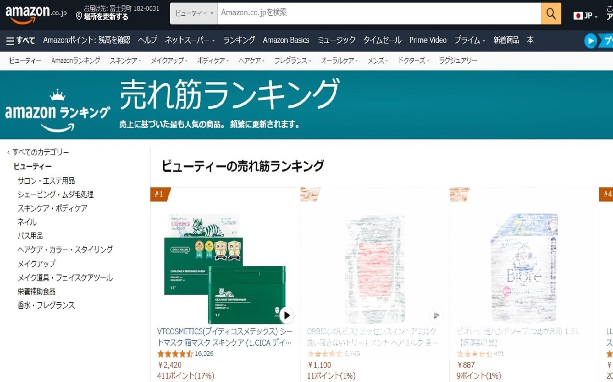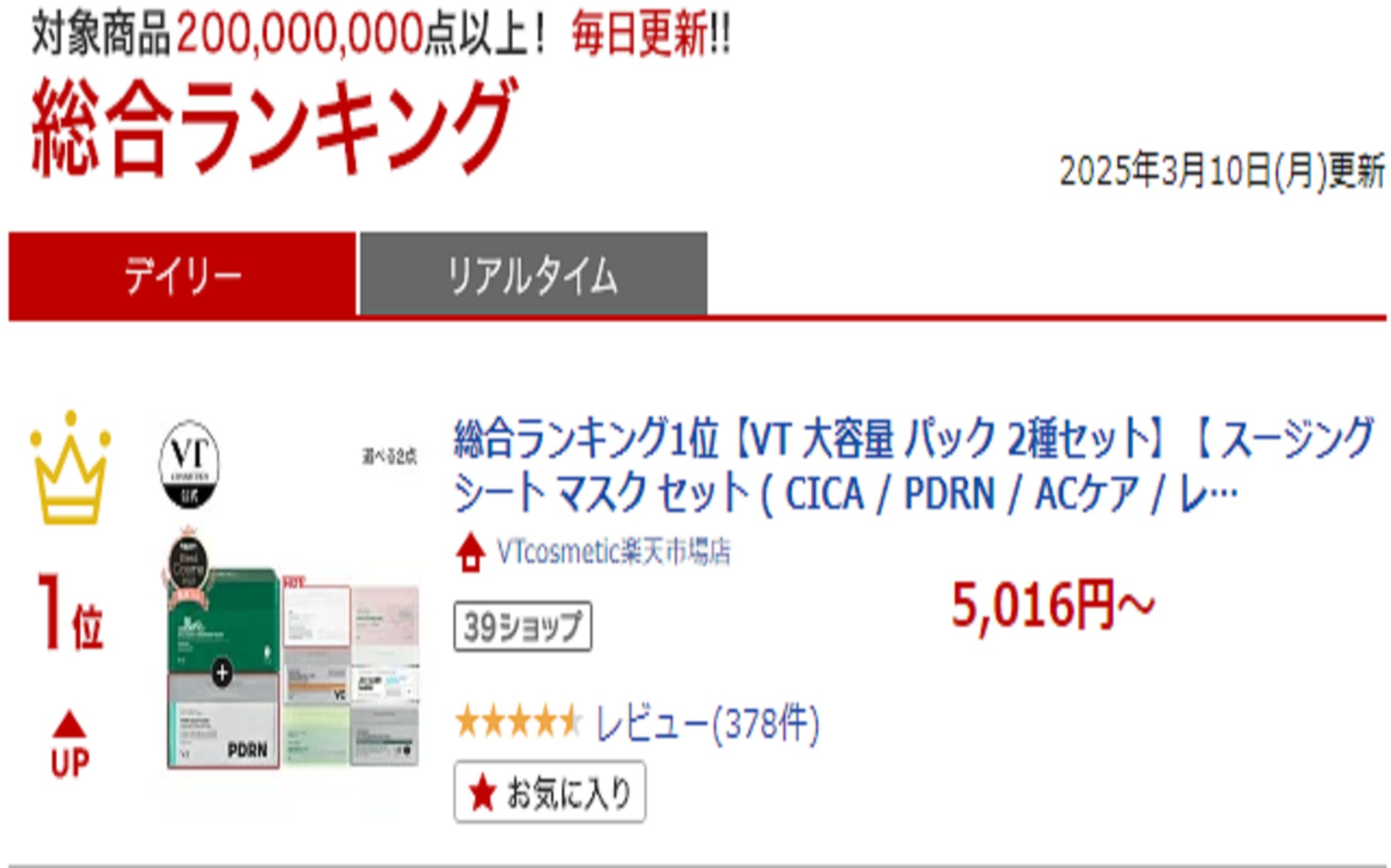 Qoo10、楽天市場、Amazonなどの国内主要のインターネット総合ショッピングサイトにて、「VT CICA デイリースージングマスク」が総合ランキング1位を取得し、ベストセラー商品に選定されるなど、日本のコスメ市場で圧倒的な支持を得ています。