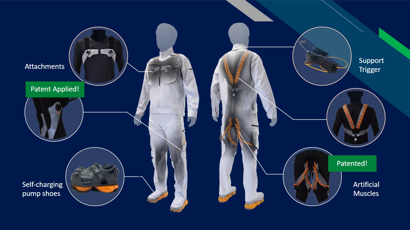薄くて強い特殊なゴムを利用した既存のパッシブ型アシストスーツのラインナップと、空気圧人工筋肉を利用した電源不要のアクティブ型アシストスーツの研究開発について発表させていただきます。