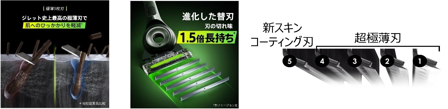より快適なシェービングを実現するために、「ジレット」史上最⾼級の5枚刃へのアップグレードに加えて、新たな刃を加えます。これまで1種類のみであった刃が、新たに2種類の組み合わせとなり、肌へのひっかかりを軽減*2します。また、進化した替刃は1.5倍刃の切れ味が⻑持ち*5するようになりました。