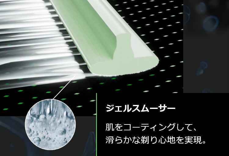 従来品と⽐較して強度と柔軟性、耐久性に優れた新素材へジェルスムーサーが変更となることで、肌を保護し、滑らかな剃り⼼地を実現します。