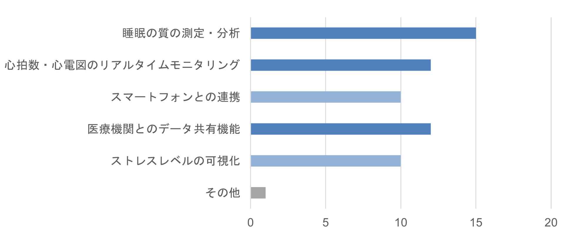 このような製品に求めることとして「睡眠の質の測定・分析」が15人と一番多く、次いで「心拍数・心電図のリアルタイムモニタリング」、「医療機関とのデータ共有機能」が12人であった。このことから、ウェアラブルデバイスで自分自身の睡眠や心拍数・心電図をチェックしたい人が多く、またそれを医療にも活かしたいと考えている人が多数いるとわかる。