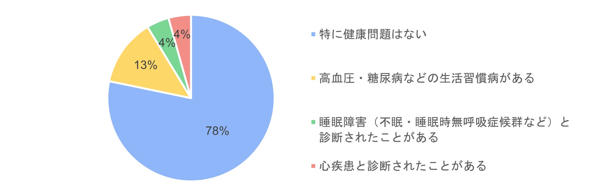 78%の人が「特に健康問題はない」、83%の人が「最近1ヶ月の間に、胸の痛みや動悸を特に感じない」と回答したことから、今の健康状態に多くの人が問題を抱えていないことがわかる。