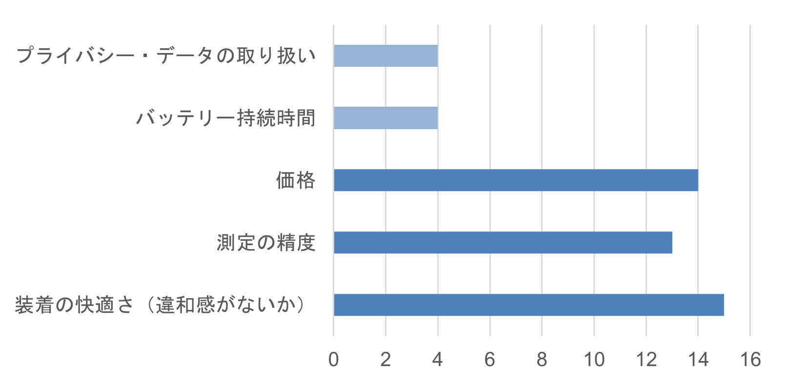 このような製品に懸念する点として「装着の快適さ(違和感がないか)」、「測定の精度」、「価格」を選択した人がそれぞれ13人以上いたことから、適正な価格で快適に精度の高い検査を受けたいと考えている人が多いとわかる。
