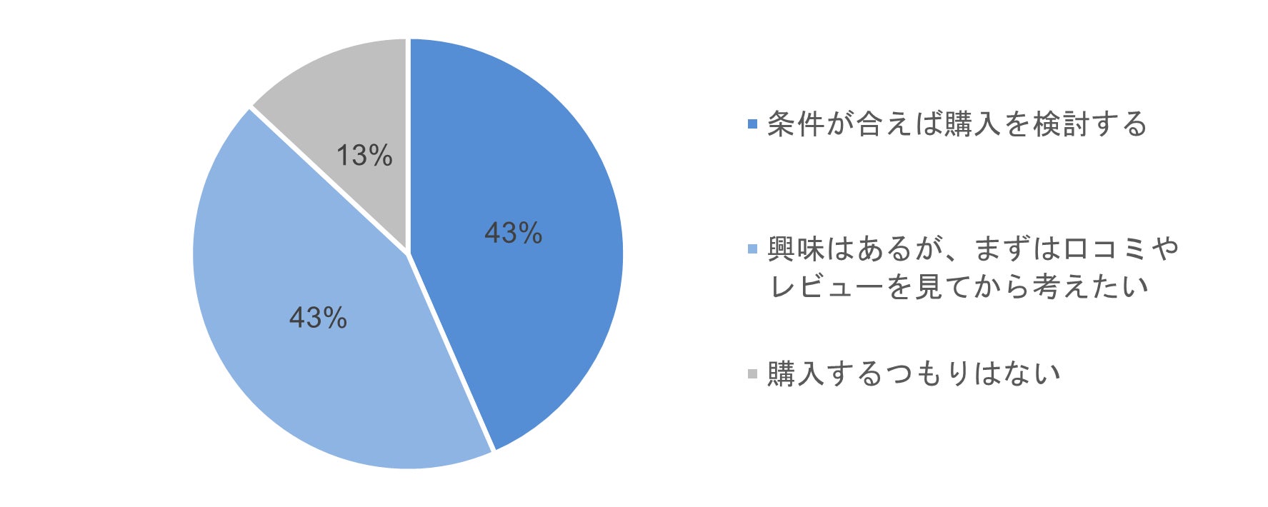 この製品が自分にとって必要だと感じた場合、購入を検討するかどうかについて、43%の人が「条件が合えば購入を検討する」、43%の人が「興味はあるが、まずは口コミやレビューを見てから考えたい」と回答したことから、計86%の人が購入について前向きに検討している人がほとんどだとわかる。