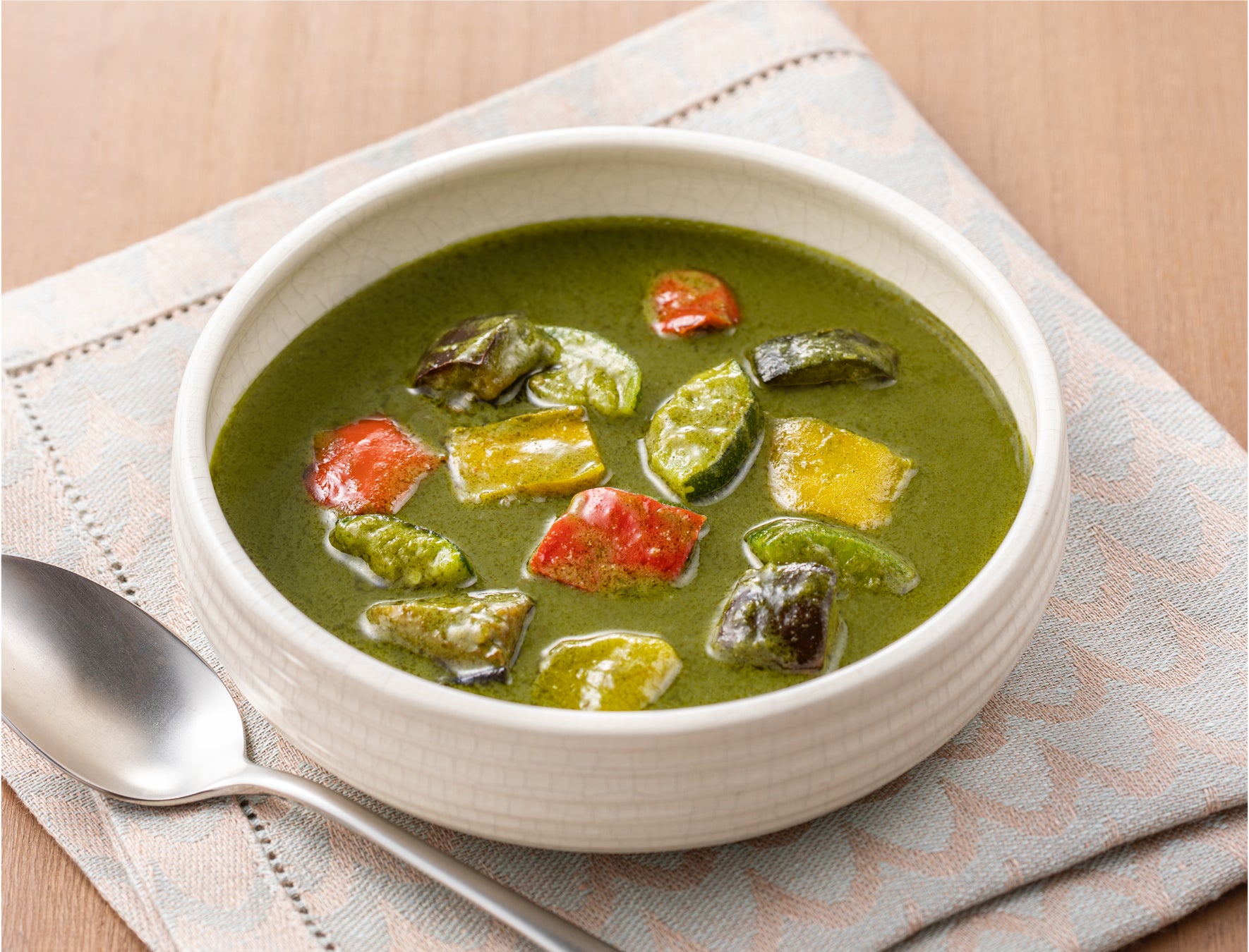 ココナッツミルクをベースに、4種のグリル野菜(ズッキーニ、赤ピーマン、黄ピーマン、なす)を使用し、食べ応えのある一品に仕上っています。さらに、複数のスパイスやハーブの芳醇な香りが食欲をそそり、爽やかな辛さの中に深いコクとまろやかさが感じられるグリーンカレーはご飯だけでなく、ナン、パンなどにもよく合います。フコキサンチンやEPAが豊富な「パブロバ」を300mg(1食180g当たり・仕込み時) 使用しており、一般的なグリーンカレーと比べて鮮やかな緑色が特徴的。