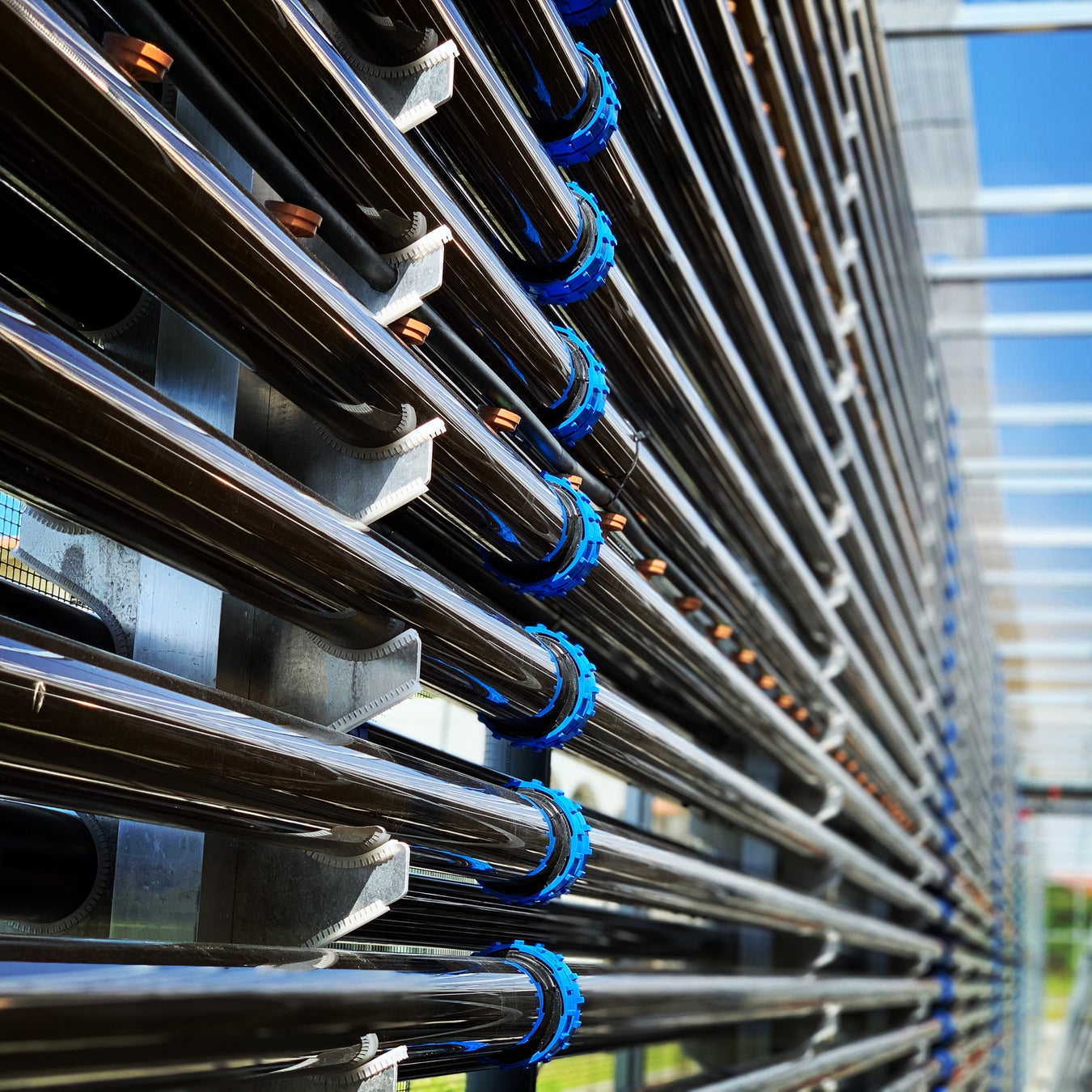 当社では、ガラスチューブ型のフォトバイオリアクターを用いることにより世界で初めてパブロバの高密度安定生産に成功しました。国内最大規模のフォトバイオリアクターで、沖縄の天然海水および太陽光を利用してパブロバを生産しています。