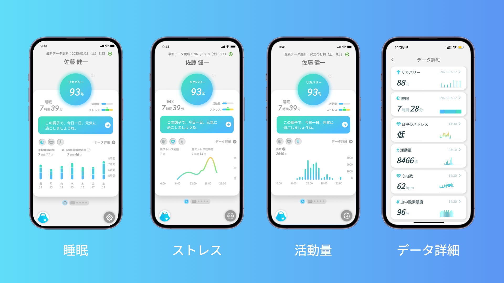 ・つけるだけで「睡眠スコア」「ストレスレベル」「活動量」を計測