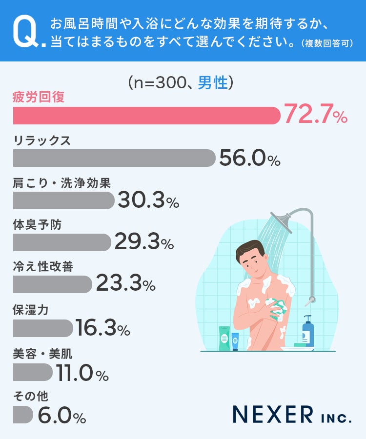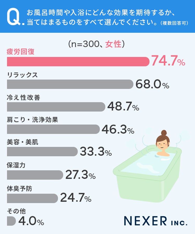 ■お風呂時間や入浴に期待すること、男女共に「疲労回復」がトップ