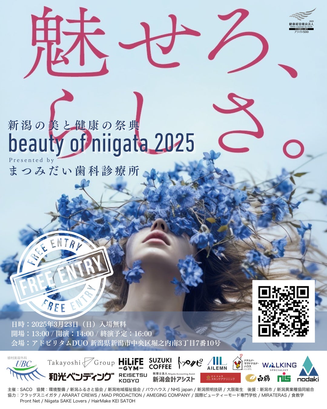 株式会社SACO(本社:新潟市、代表取締役 迫慶太)は、2025年度健康経営優良法人認定「ブライト500」を取得し、3月23日に「BEAUTY OF NIGATA2025」を開催します。本イベントは、「魅せろ、らしさ。」をテーマに、健康経営に取り組む企業や医療従事者と共に、美と健康に特化したアカデミーで学び、表現する舞台を提供。地域活性化と多様性の推進を目的とし、新潟市「新潟アドビリタムDUO」にて実施されます。健康と美を融合した新たな価値を創造し、新潟の魅力を発信するイベントです。