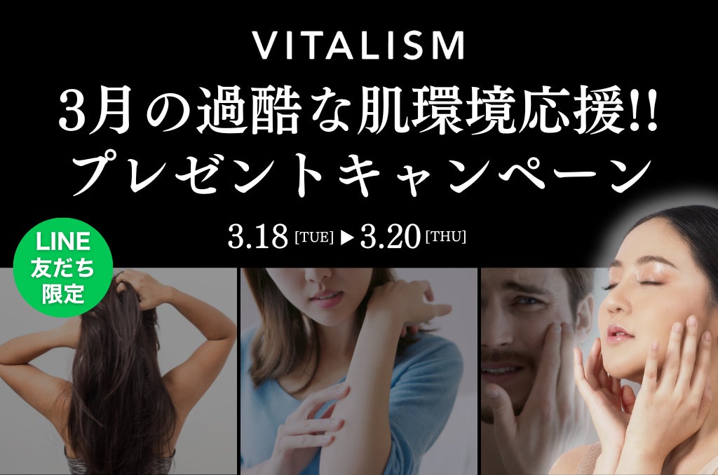 株式会社ヘアジニアス・ラボラトリーズ(本社:東京都渋谷区、代表取締役:津田知明)が展開する東京・表参道の頭皮ケアクリニックの思いから生まれたトータルケアブランド「VITALISM」は、2025年3月18日(火)〜3月20日(木)まで公式LINE登録者限定のキャンペーンを開催いたします。