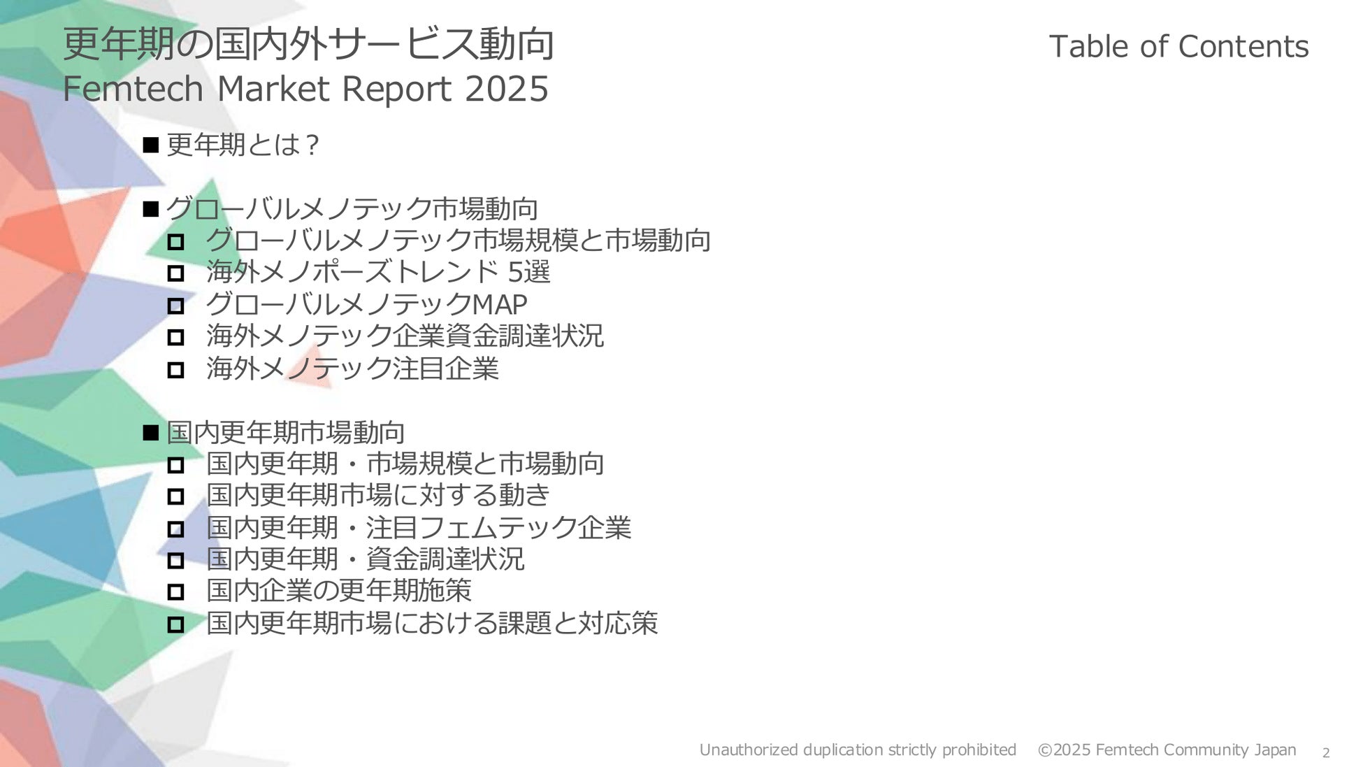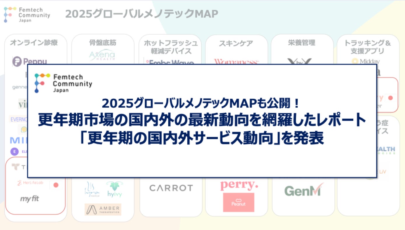 一般社団法人Femtech Community Japan(東京都渋谷区、代表理事 皆川朋子、以下Femtech Community Japan)は、昨年発表した更年期に関するレポートをアップデートし、新たに「更年期の国内外サービス動向 – Femtech Market Report 2025Q2 – 」として公開しました。なお、レポート配布につきましては、会員企業様限定の方針とさせていただいております。ご希望ございましたら個別ご相談ください。