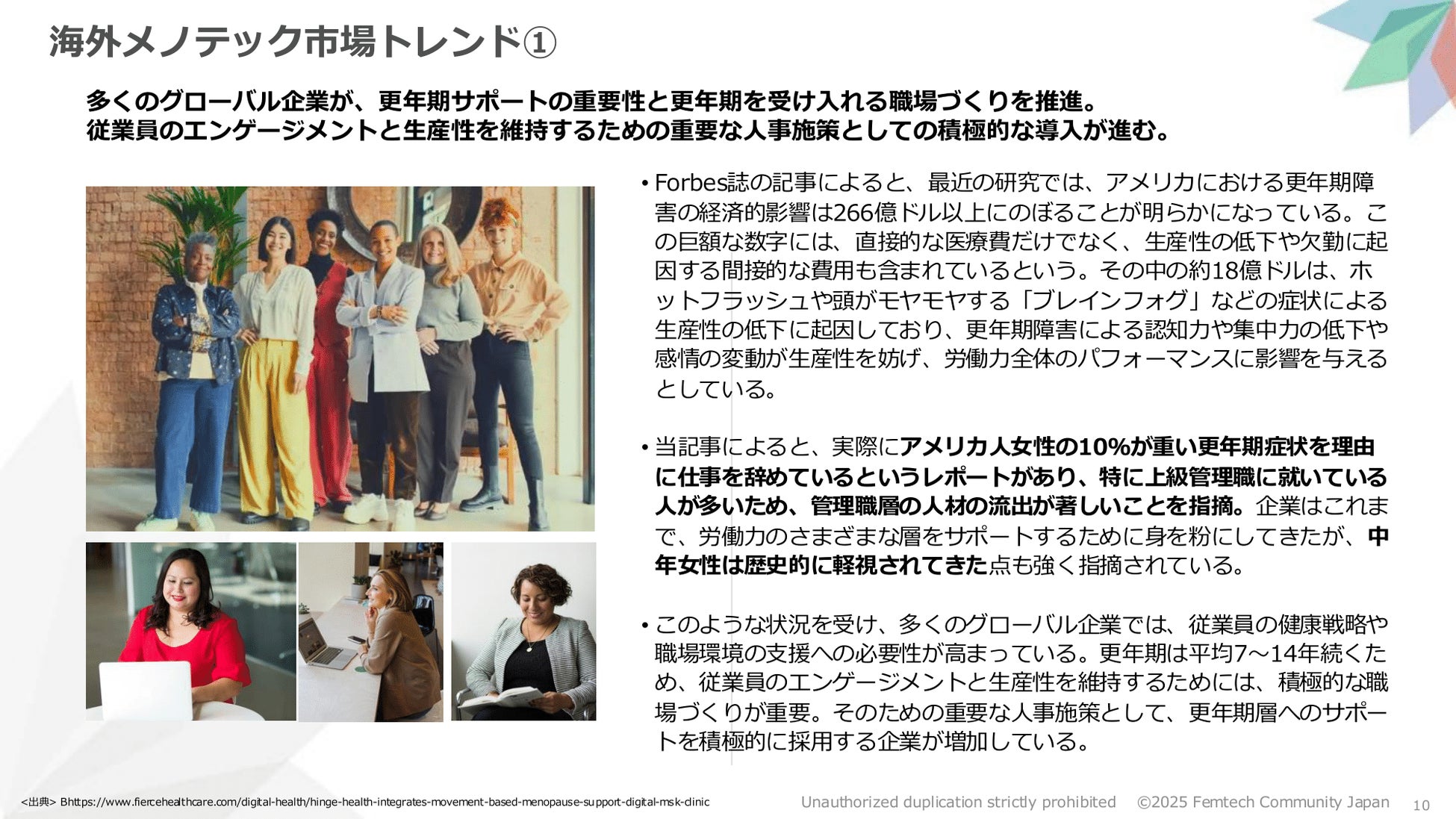 今後、更年期に関する政策や企業の取り組みはさらに進展すると期待されており、Femtech Community Japanは引き続き最新の動向を追いながら、社会全体での理解促進と環境整備に貢献していきます。特に、更年期領域は情報が不足している一方で、多くの関心を集めているため、当団体としても積極的にキャッチアップし、発信を強化していきます。