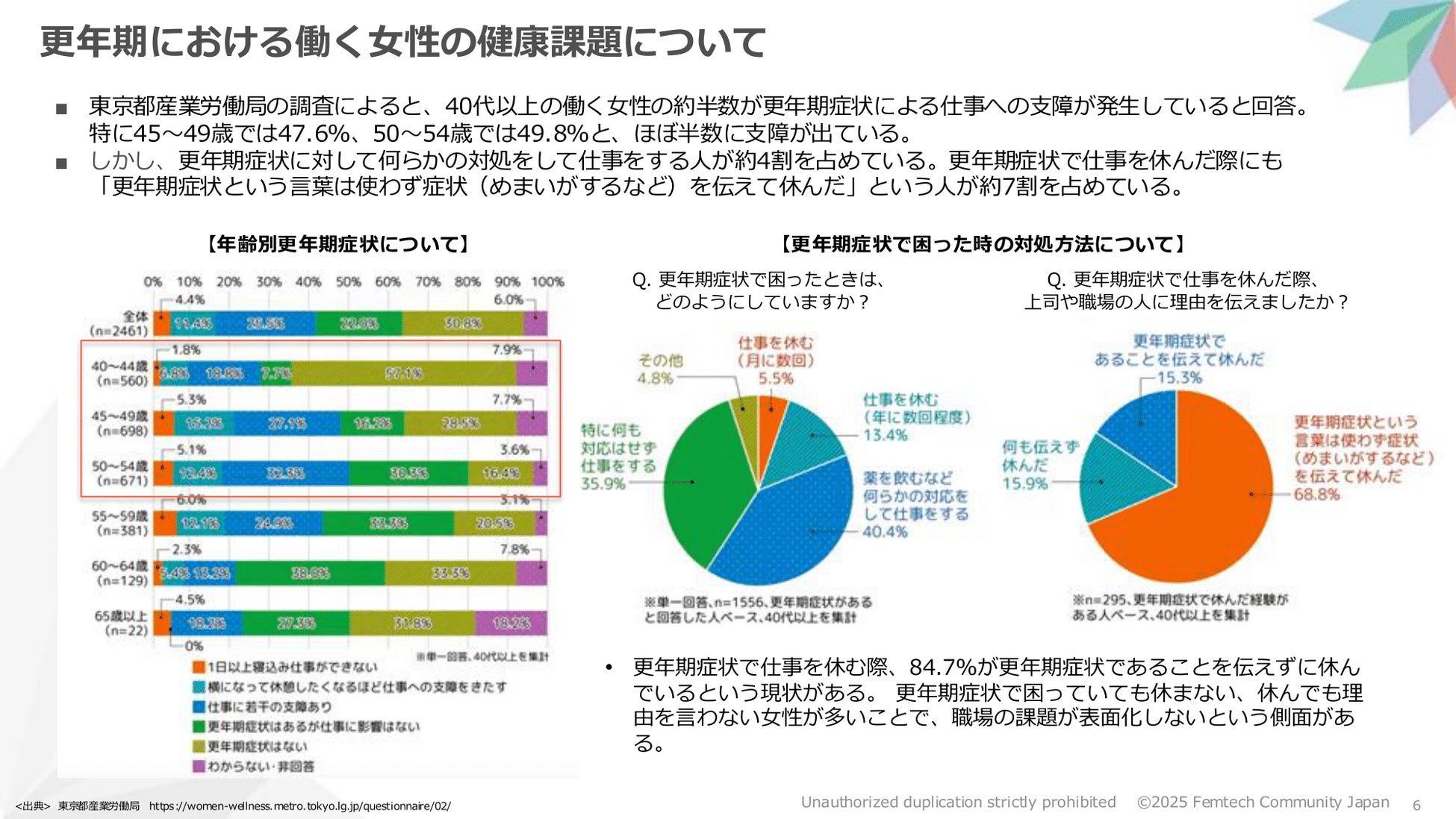 東京都産業労働局の調査によると、40代以上の働く女性の約半数が更年期症状による仕事への支障が発生していると回答。特に45~49歳では47.6%、50~54歳では49.8%と、ほぼ半数に支障が出ていると回答しているにも関わらず、更年期症状に対して何らかの対処をして仕事をする人は40.4%しか占めていない。また、更年期症状で仕事を休む際、84.7%が更年期症状であることを伝えずに休んでいるという現状で、更年期症状で困っていても休まない・休んでも理由を言わない女性が多いことで、職場の課題が表面化しないという側面があることがわかっています。