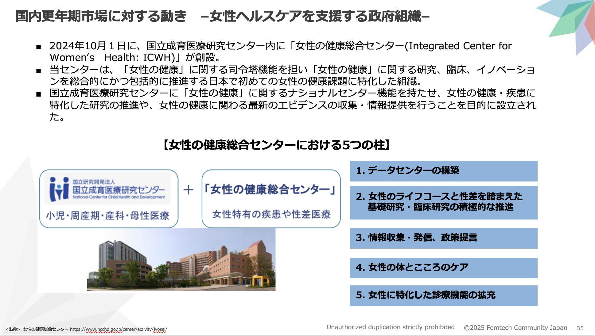 国内更年期市場に対する動きとしては、女性活躍推進や少子化対策などの社会的課題への政策の必要性も後押しし、政府が主導となって各省庁が女性ヘルスケアの課題解決への取り組みを拡大。女性版骨太の方針2024でも、フェムテック議連の提言も多く取り入れられています。また、「女性の健康総合センター(Integrated Center for Women’s Health: ICWH)」が創設され、女性ヘルスケアを支援する政府組織としての役割を担うことになりました。同センターは、国立成育医療研究センター内に設置され、女性の健康や疾患に特化した研究を推進するとともに、最新のエビデンスの収集や情報提供を行うことを目的としています。