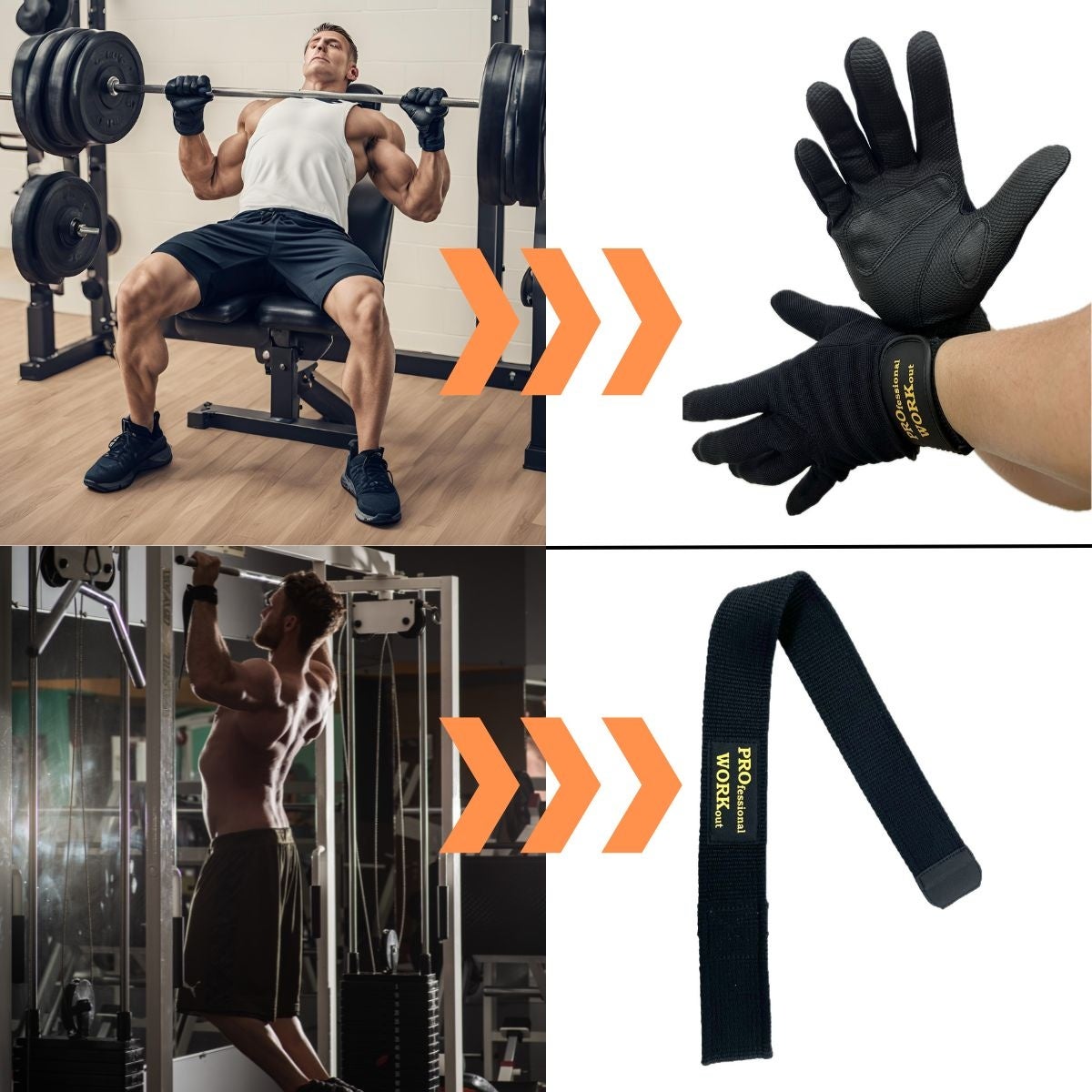 ベンチプレスではグローブを、チンニング(懸垂)ではストラップを使うことによって効果的にトレーニングを行うことができる。