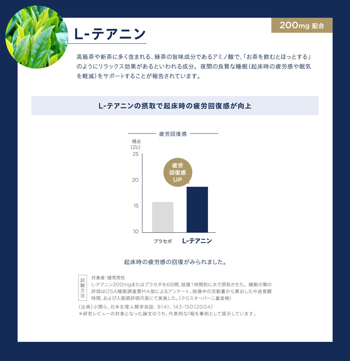 L-テアニンは、夜間の良質な睡眠(起床時の疲労感や眠気を軽減)を支えます。